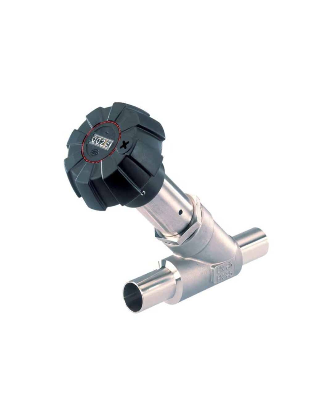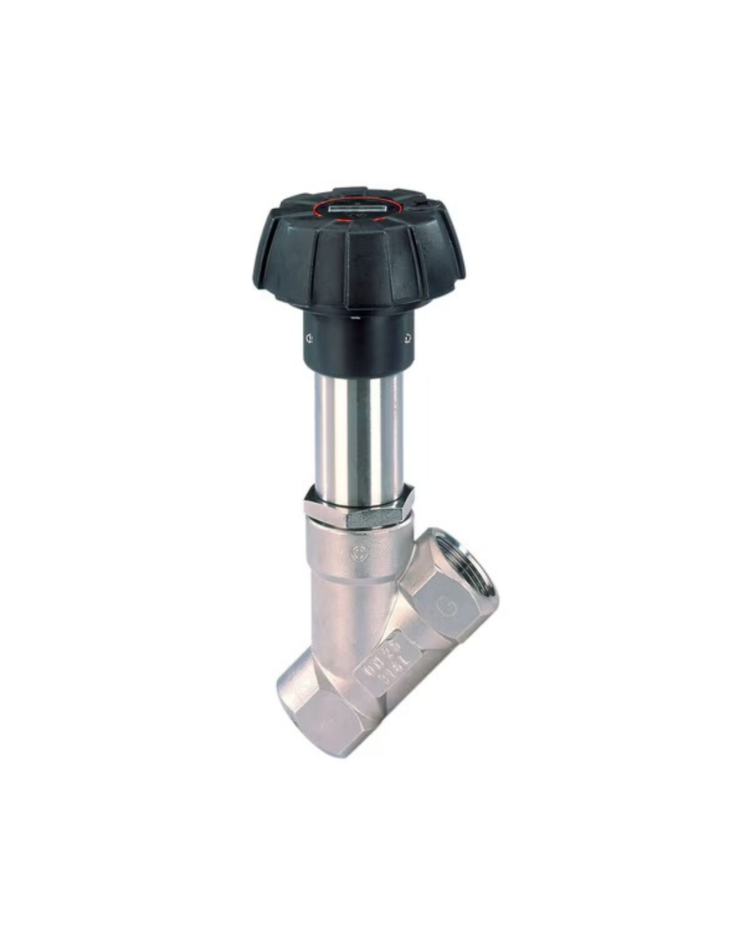 La válvula reguladora 2702 consiste en un cuerpo de válvula de asiento inclinado de acero inoxidable con actuador manual. El cono de válvula parabólico proporciona aproximadamente un 35% más de capacidad de flujo que las válvulas de control convencionales. Está disponible con acero inoxidable sobre acero inoxidable o con una junta de PTFE duradera, que proporciona un cierre hermético. El caudal deseado puede ajustarse fácilmente a través de un indicador de posición de gran exactitud. La versión con accionamiento neumático del Tipo 2702 ya no está disponible desde el 01/07/2020. Su sucesor es el Tipo 2300.
