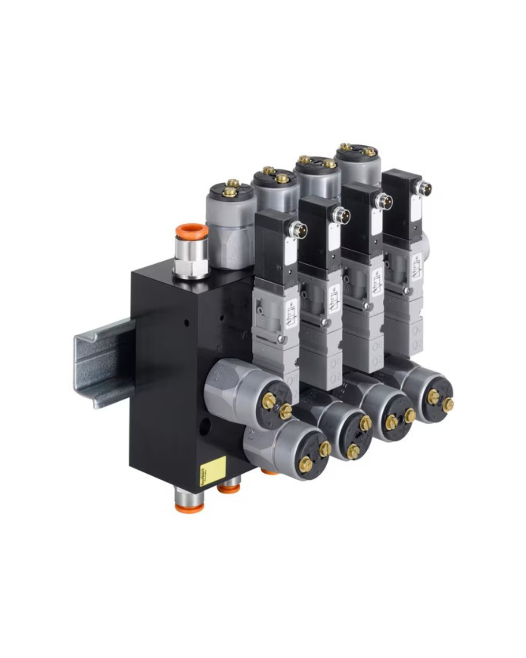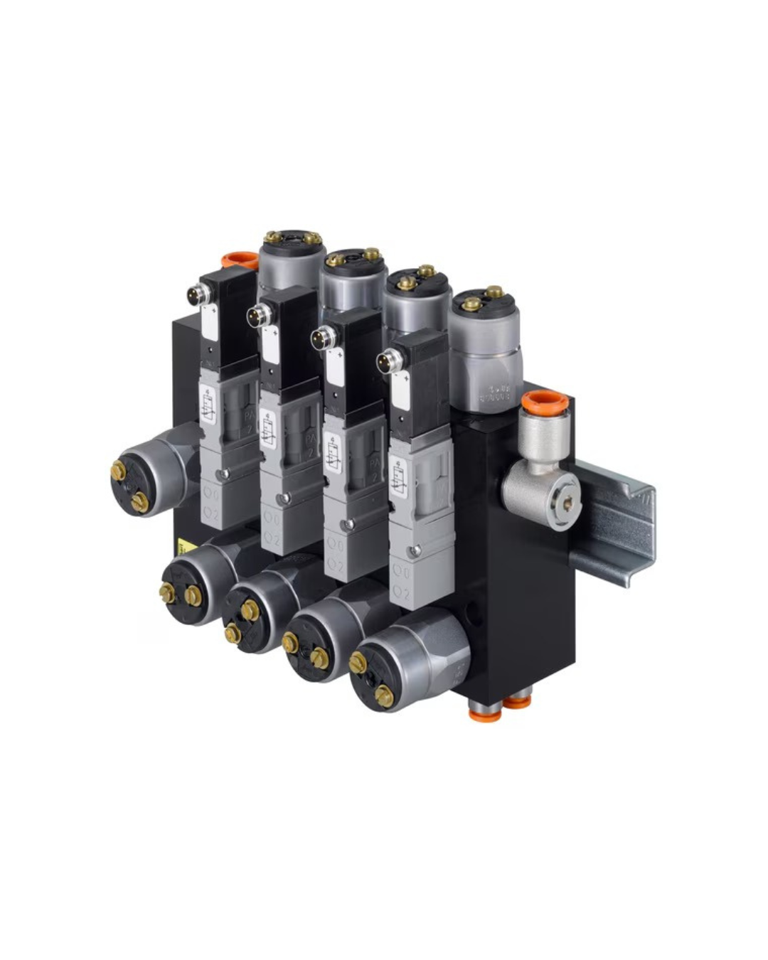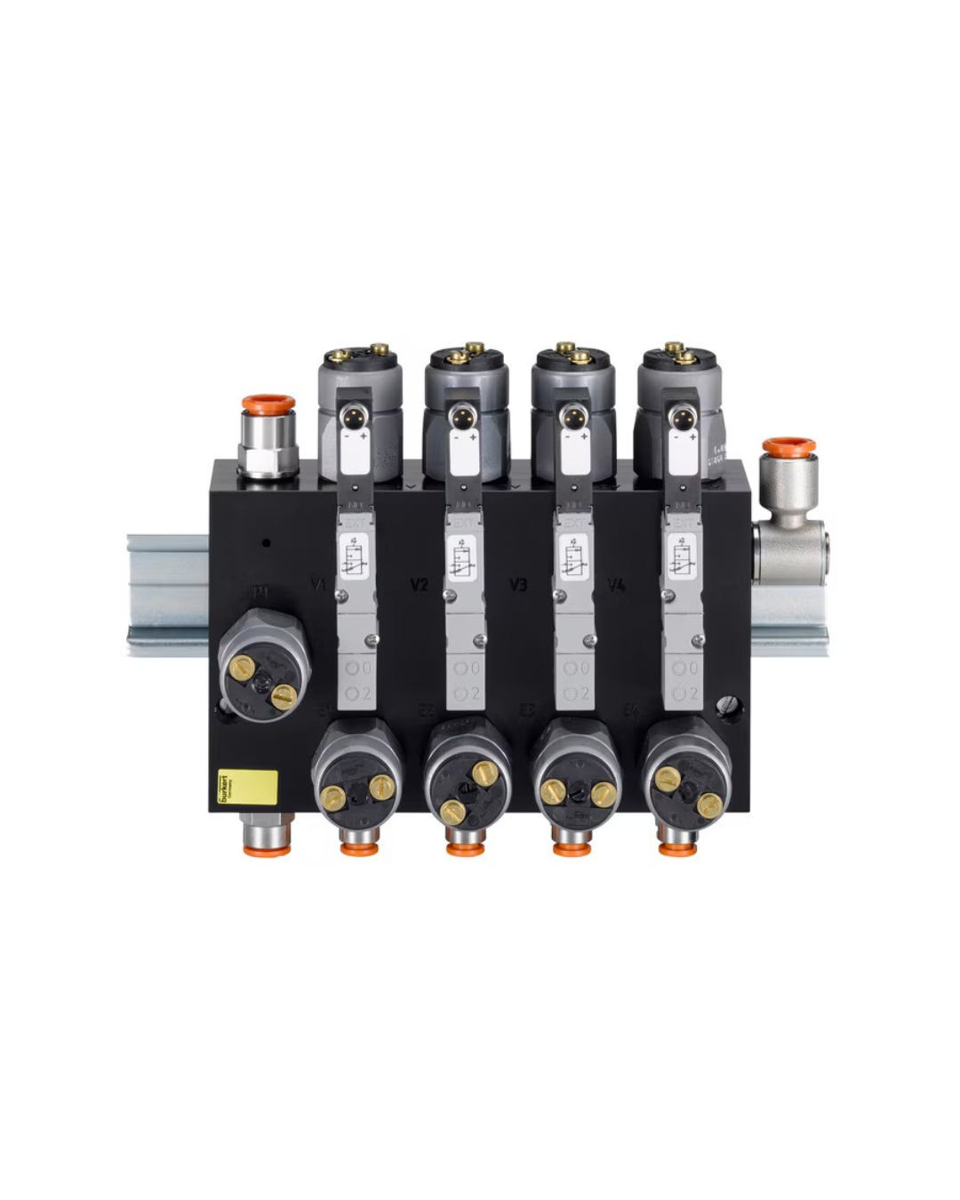 El tipo MKRS amplía la operabilidad múltiple del terminal de válvulas de tipo 8640 y el sistema de automatización de tipo 8644. De este modo se pueden establecer funciones de desconexión redundantes en combinación con los tipos de válvula neumática 6524 y 6525 para la desconexión de seguridad. Así se puede obtener una desconexión de seguridad según la directiva de máquinas EN ISO 13849 hasta el Performance Level D.